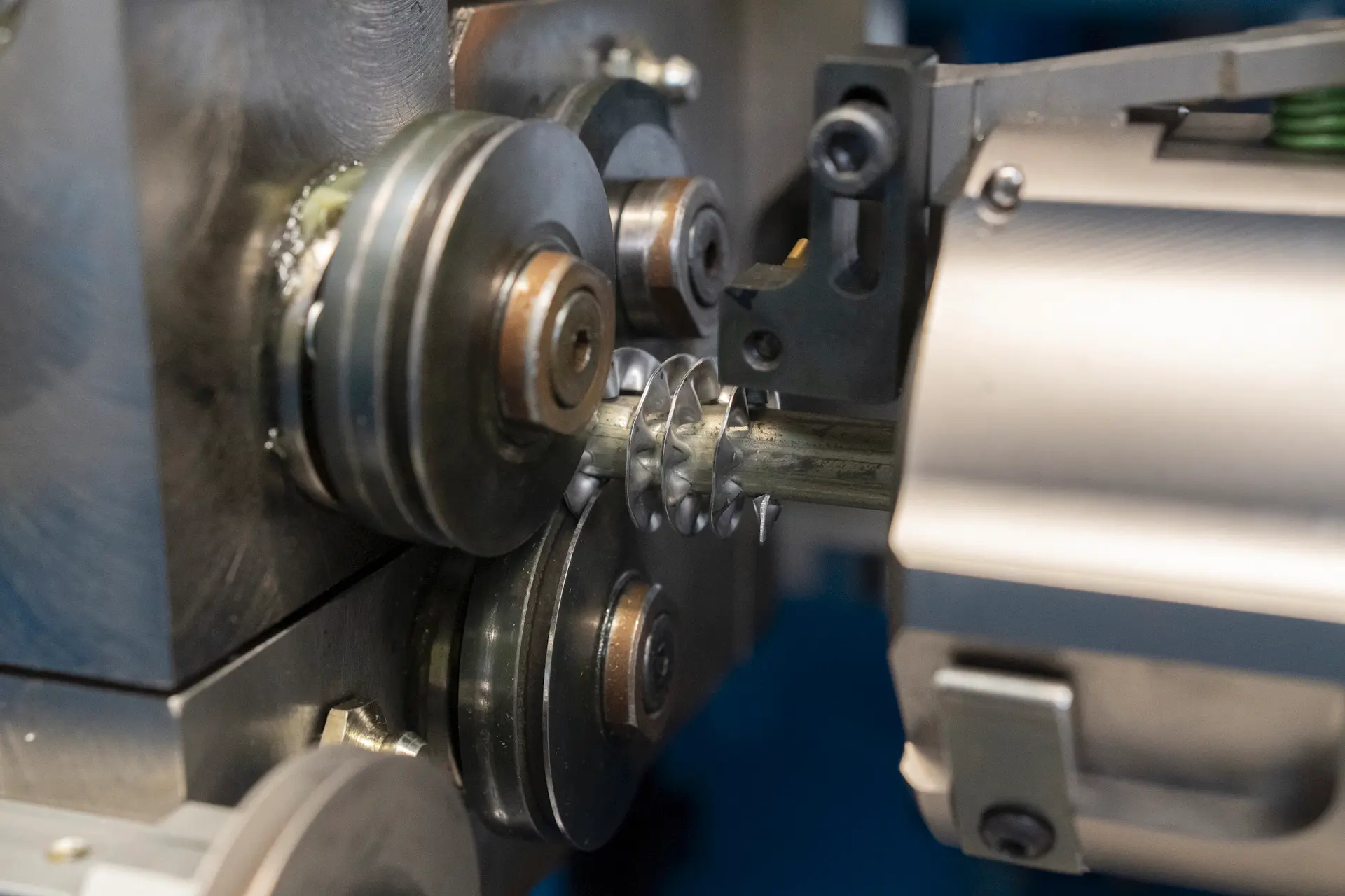The element is pushed forward until it stops against the stop on the rotating spindle of the finning carriage.