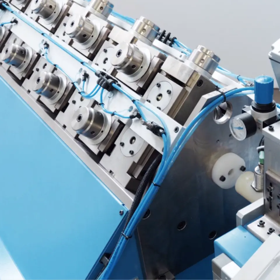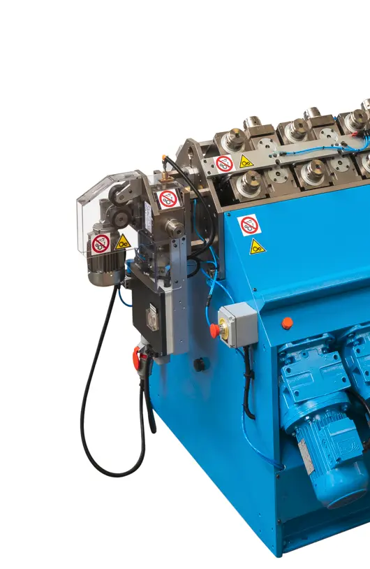 The axial marking system uses interchangeable characters, enabling the marking of key identification data such as voltage (V) and power (W) values. After exiting the roll reduction mill, the heating elementgoes through two non-motorized rolls: the first carries the marking characters, and the second serves as a counter-roller to ensure precise pressure and clear, accurate marking.