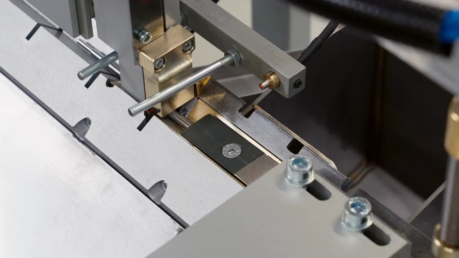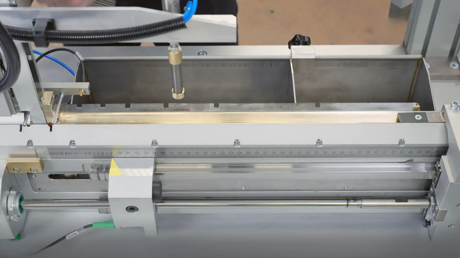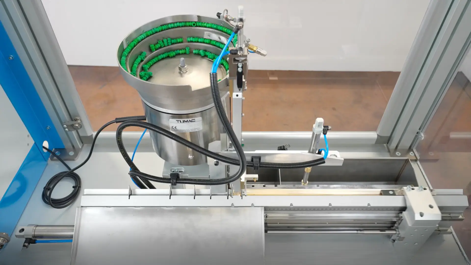 An adjustable hopper feeds the terminal pins into the assembly location where an air cylinder drives the plug to the proper location on the pin. Standard collets are used to clamp the tubing, and this makes changing diameters very simple and fast. It can accommodate different diameters and plug sizes.