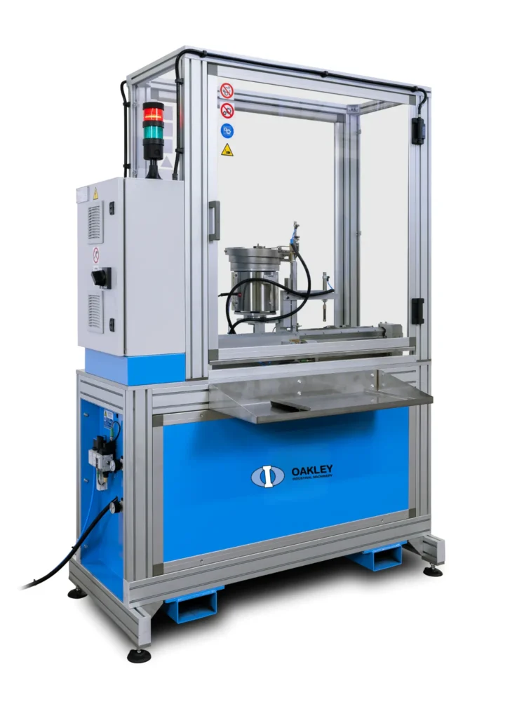 The Oakley plug to pin assembly machine is designed to rapidly assemble the plug that is normally used to seal the lower end of the elements prior to the filling operation to the lower terminal pin.
