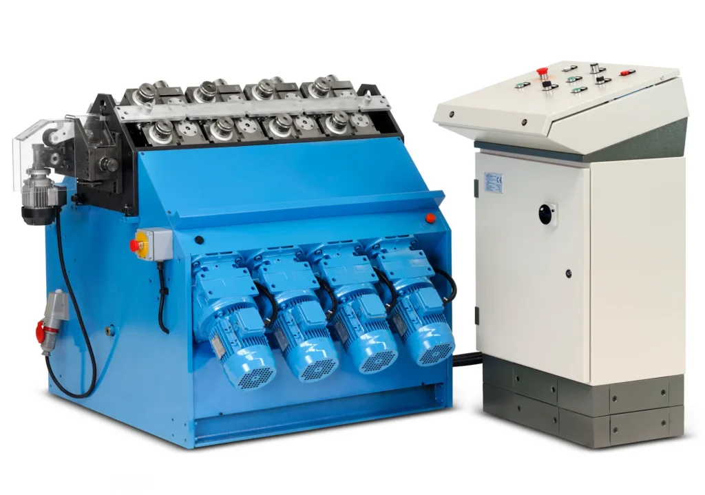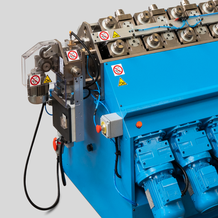 In the rolling mill with a variable roll rotational speed, there is the possibility to program the rotation speed for each pair of rolls through frequency inverters, depending on the elongation of the elements. This solution allows to set the machine for different tube materials. Five sets of program scales of roll speed are available. Each pair of rolls will have a speed corresponding to the elongation of the tube, depending on the tube material. Having control of the speed of each roll station, it is possible to match as closely as possible the elongation occurring. This means that there is less friction between the rolls and tube, and therefore less heat generated by friction. As a result, the rolls last longer and the elements exit straighter.