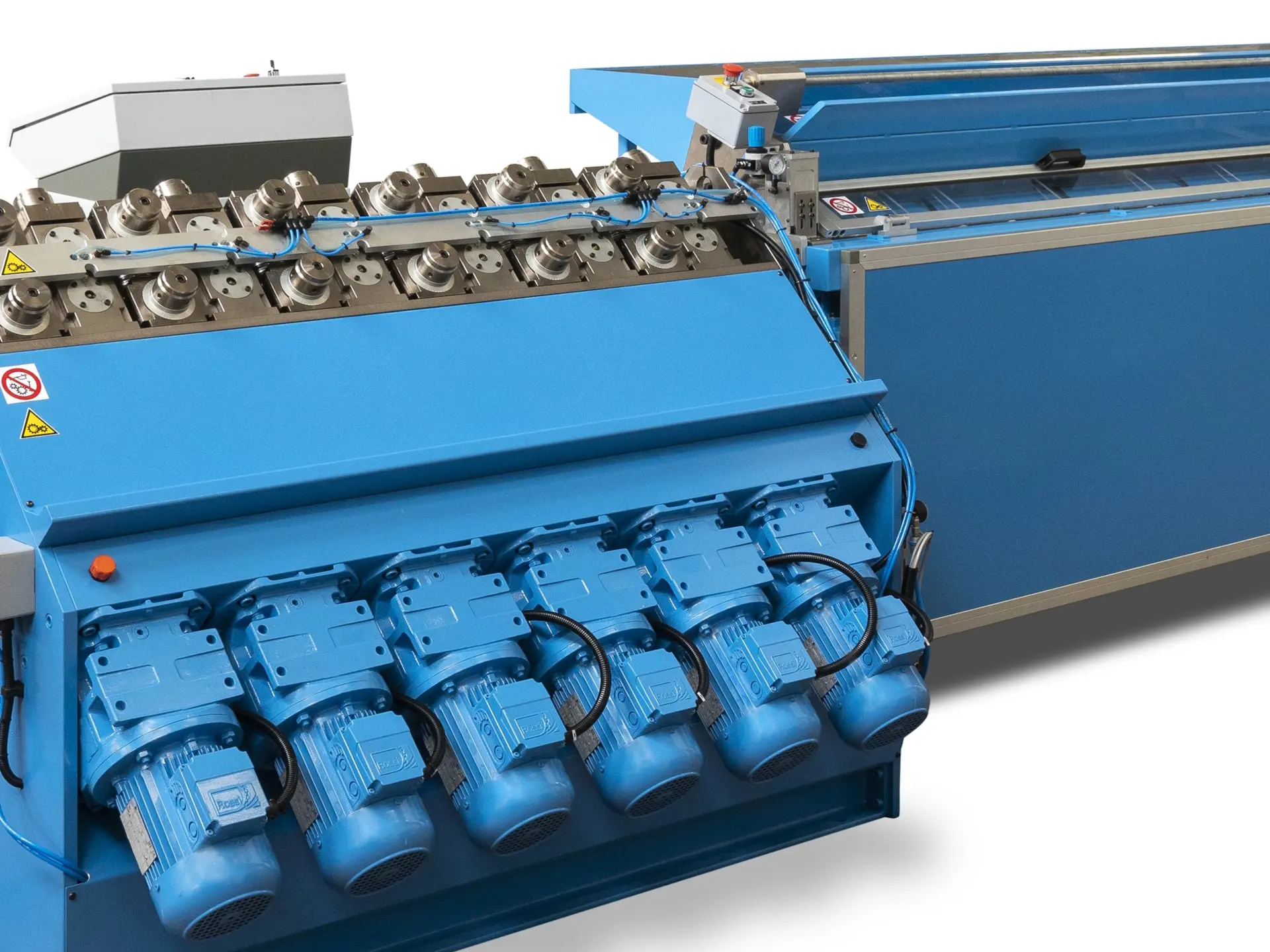The 12-station version has 12 pairs of rolls, ten of which have a reducing function and two a calibrating function. All machines are now equipped with 2-HP motors as standard, ensuring adequate roll pressure even for larger tube diameters. The advantages of the 12-station rolling mill compared to the 8-station version are: