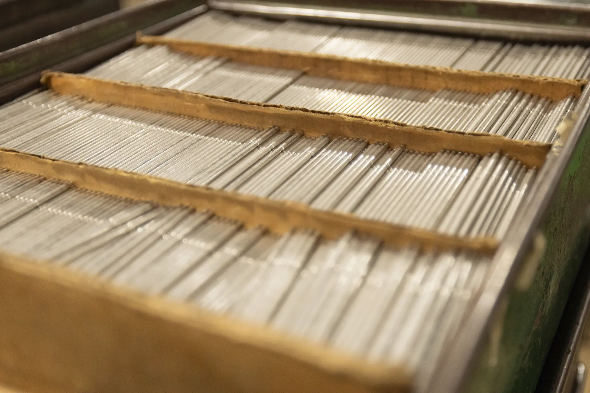 The wire is supplied from spools or stems, then passed through a rotary straightener where it is cleaned and cut to the required length. The straightener can produce pin blanks ranging from 50 mm (2.0″) to 140 mm (5.5″) at a rate of 10,000 pieces per hour, and pin blanks from 140 mm (5.5″) to 229 mm (9.0″) at a reduced rate of 5,000 pieces per hour.