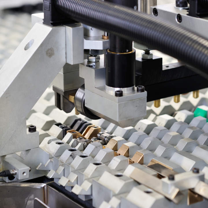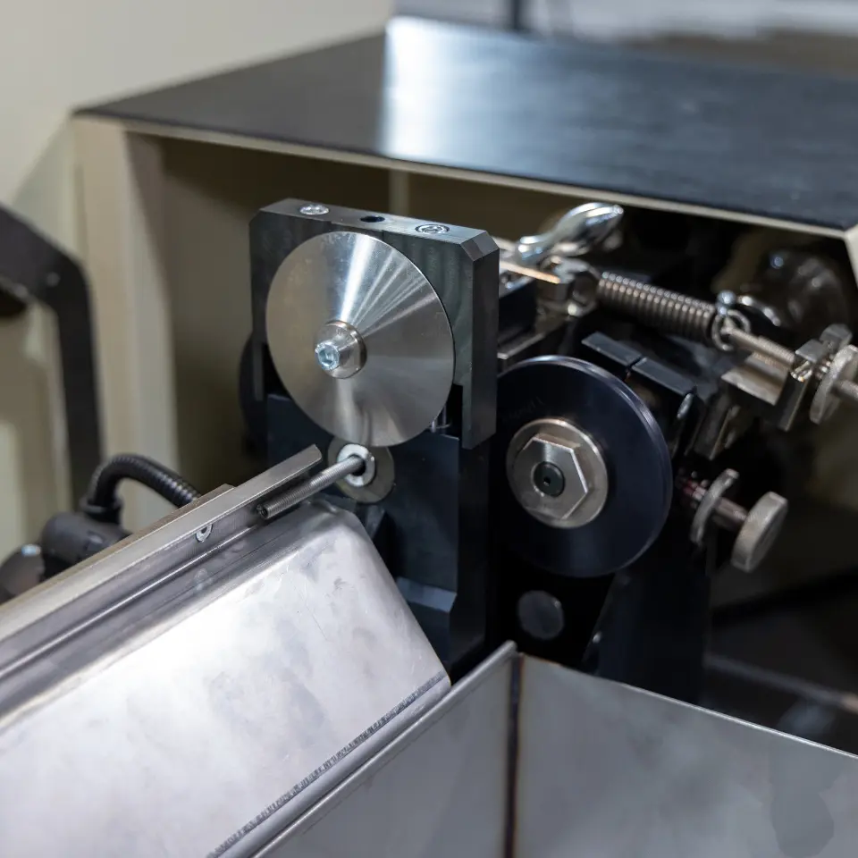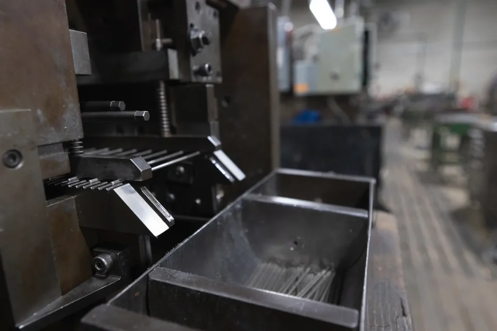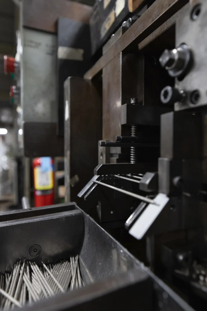 After cutting, the pin blanks are loaded into the hopper at the rear of the Cold Heading Machine. They are then fed through a sequence of progressive dies that gradually form the terminal pin ends. The Cold Heading Machine produces 7,740 pieces per hour for wire diameters between 1.57 mm (0.062″) and 2.0 mm (0.079″), and 5,160 pieces per hour for diameters between 2.1 mm (0.083″) and 3.18 mm (0.125″).