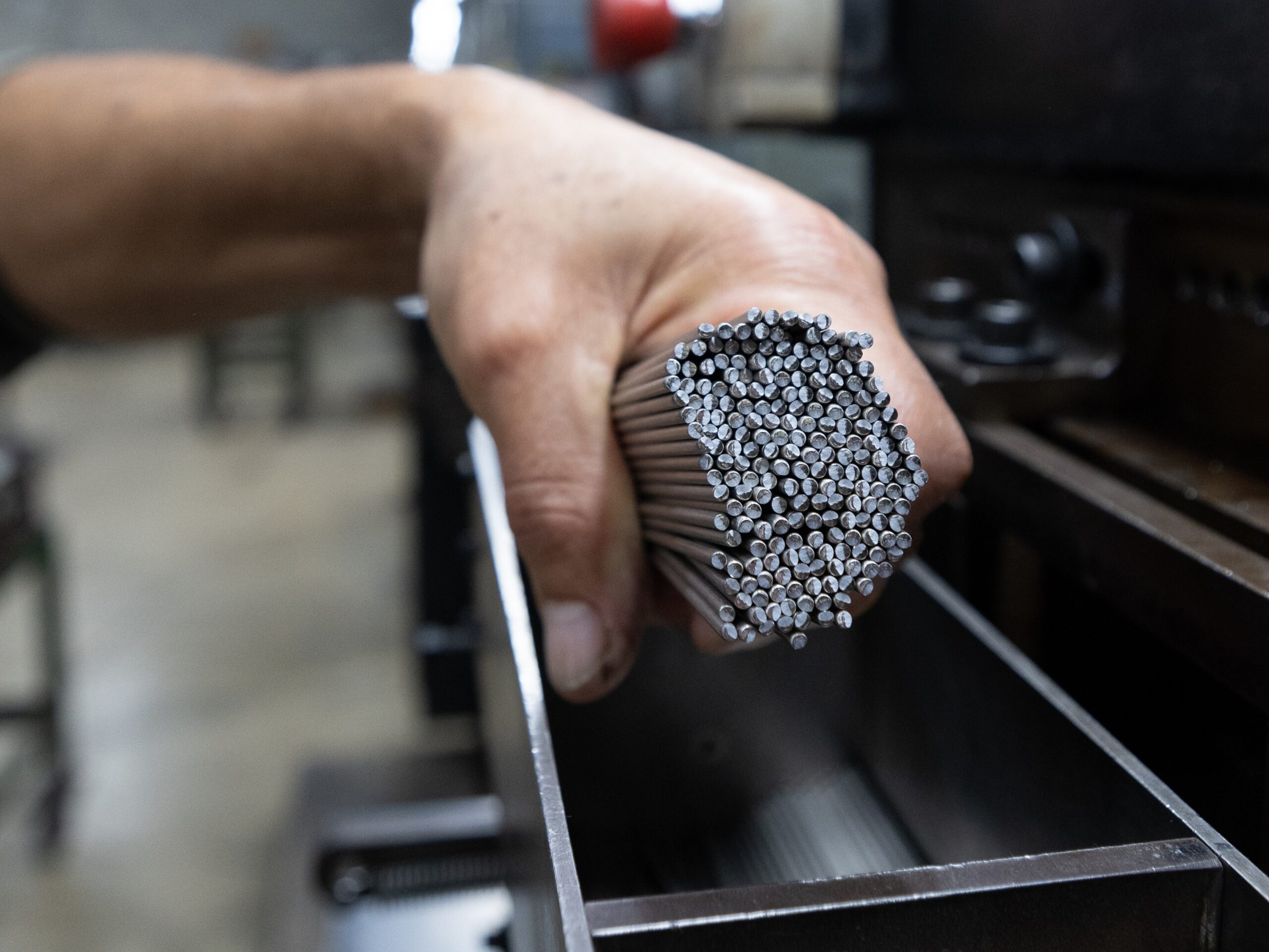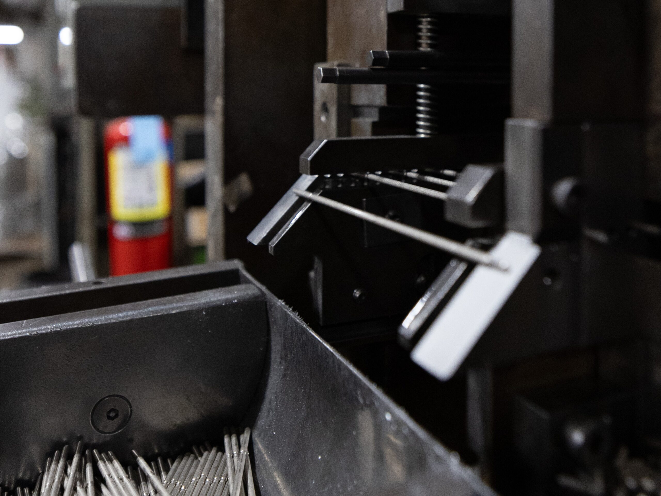 All of the pins manufactured by Oakley are provided in a consistent orientation. This allows the pins to be easily fed to the machines to install the plastic plugs or weld the pins to the coils.