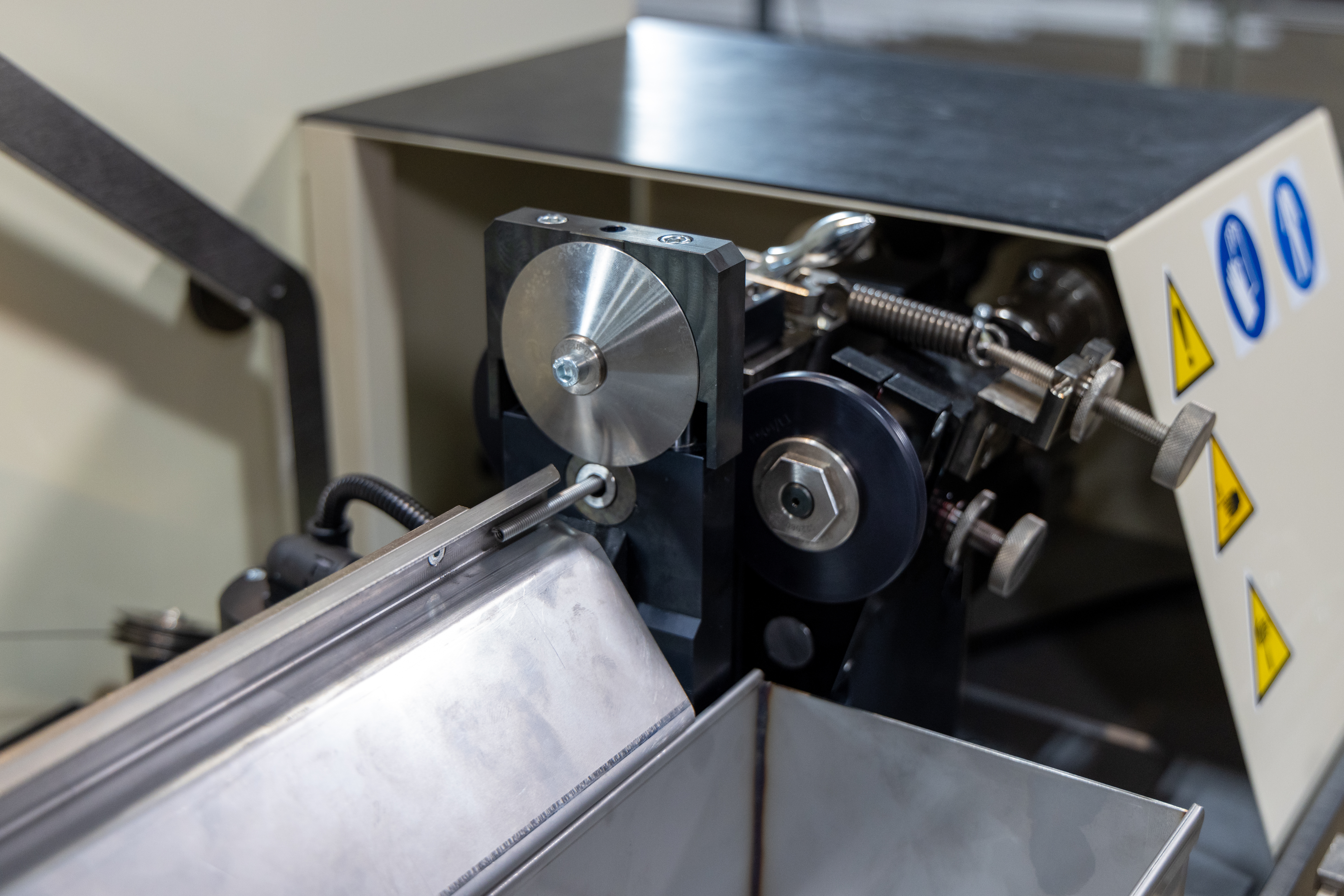 The coiling machine is equipped with a mechanical reactive braking system which controls automatically the wire tension through controlled spool braking. Furthermore, it has a system to separate coils through cutting blade, with the possibility to program up to 100 separations depending on the programmed ohmic value.